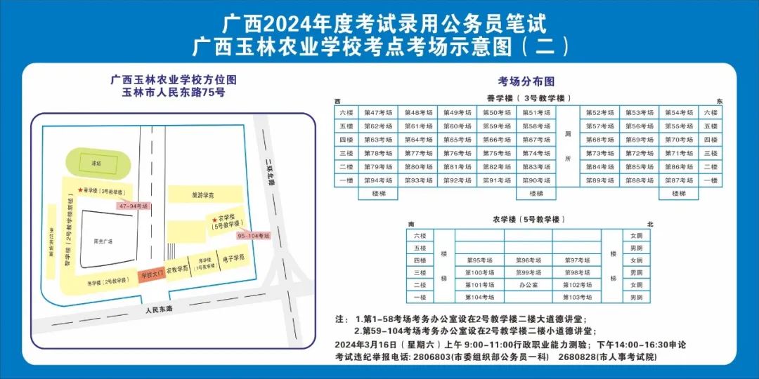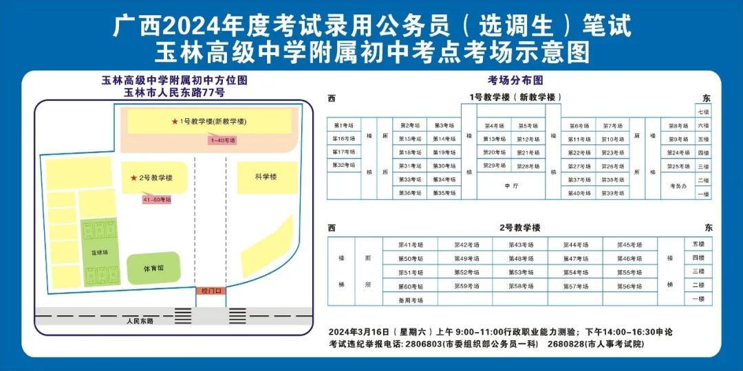 2024年選擇在玉林考區(qū)參加考試的考生人數(shù)較多,屆時考點區(qū)域內的食宿、交通較為緊張。請?zhí)崆傲私獗救怂诳键c具體位置,熟悉考點周邊情況,根據考點的情況合理做好食宿安排和出行計劃。需要特別注意的是:玉林市第一職業(yè)中等專業(yè)學??键c是設在該校的東校區(qū)(人民東路東235號);玉林市第一中學考點是設在該校的運嶺路校區(qū)(二環(huán)北路1228號)!