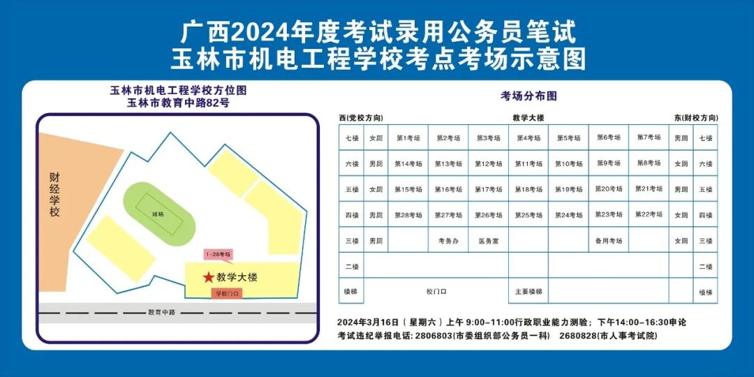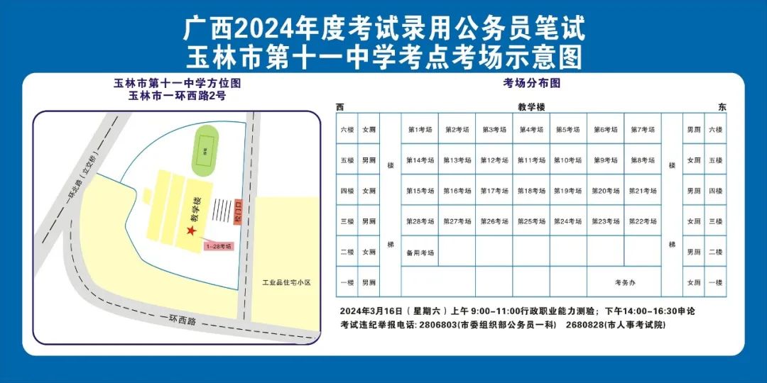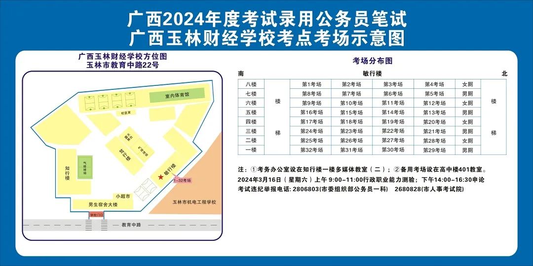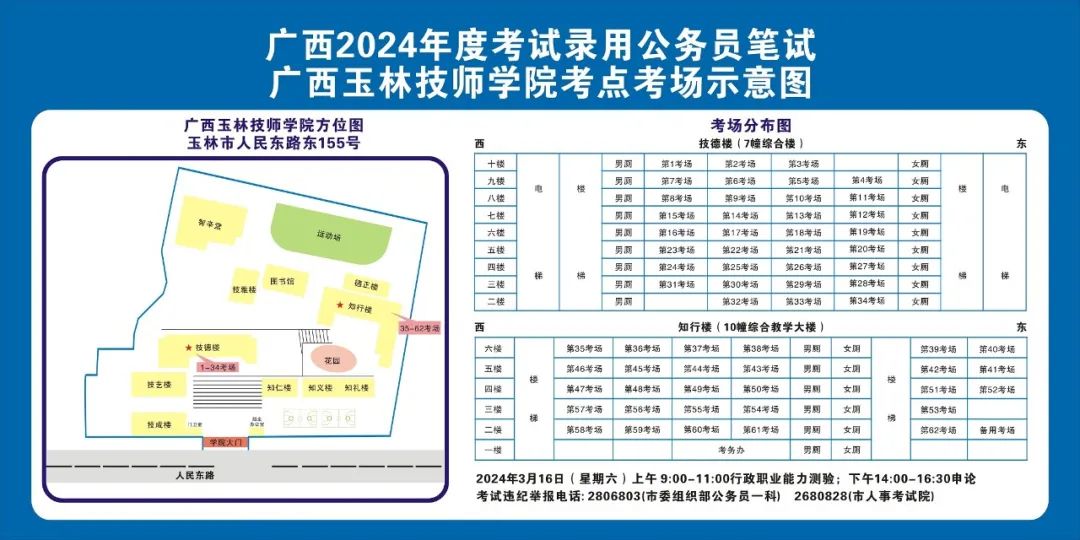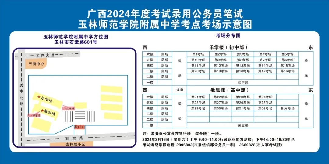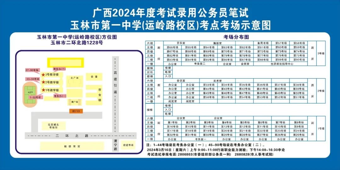 除考試當天考生可以進入考點外,考生不得提前進入考點查看考場(學校將在大門處擺放考場分布示意圖),玉林考區(qū)10個考點的考場布置情況如下: