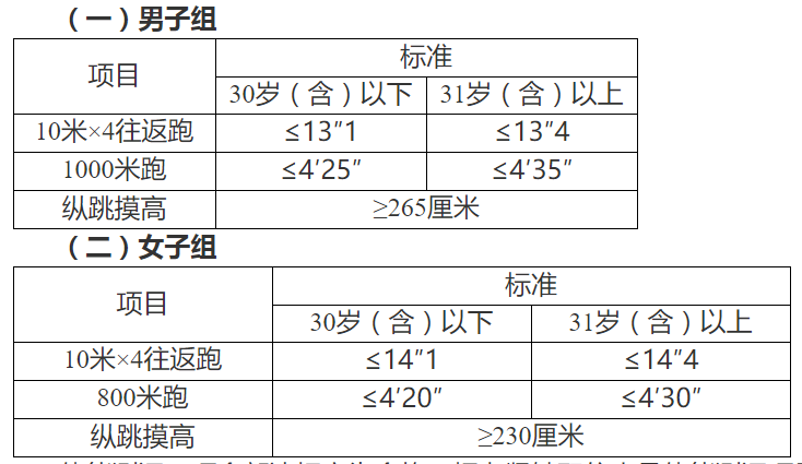 體能測評三項全部達標(biāo)方為合格。報考緊缺職位人員體能測評項目三項中有兩項達標(biāo)的,視為合格。體能測評項目中,縱跳摸高項目的測評次數(shù)不超過3次,10米×4往返跑項目的測評次數(shù)不超過2次,男子1000米跑、女子800米跑項目的測評次數(shù)為1次。