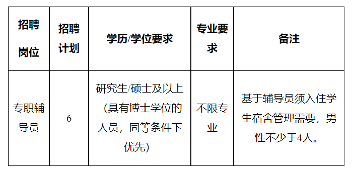 (四)年齡不超過30周歲,即1993年12月1日及之后出生;具有博士學位的,或具有高級職稱的,或有專職輔導員工作經驗且在各類輔導員職業(yè)能力競賽、輔導員評優(yōu)評先等活動中獲得過省部級(含)以上獎勵表彰者,年齡可放寬至35周歲,即1988年12月1日及之后出生。