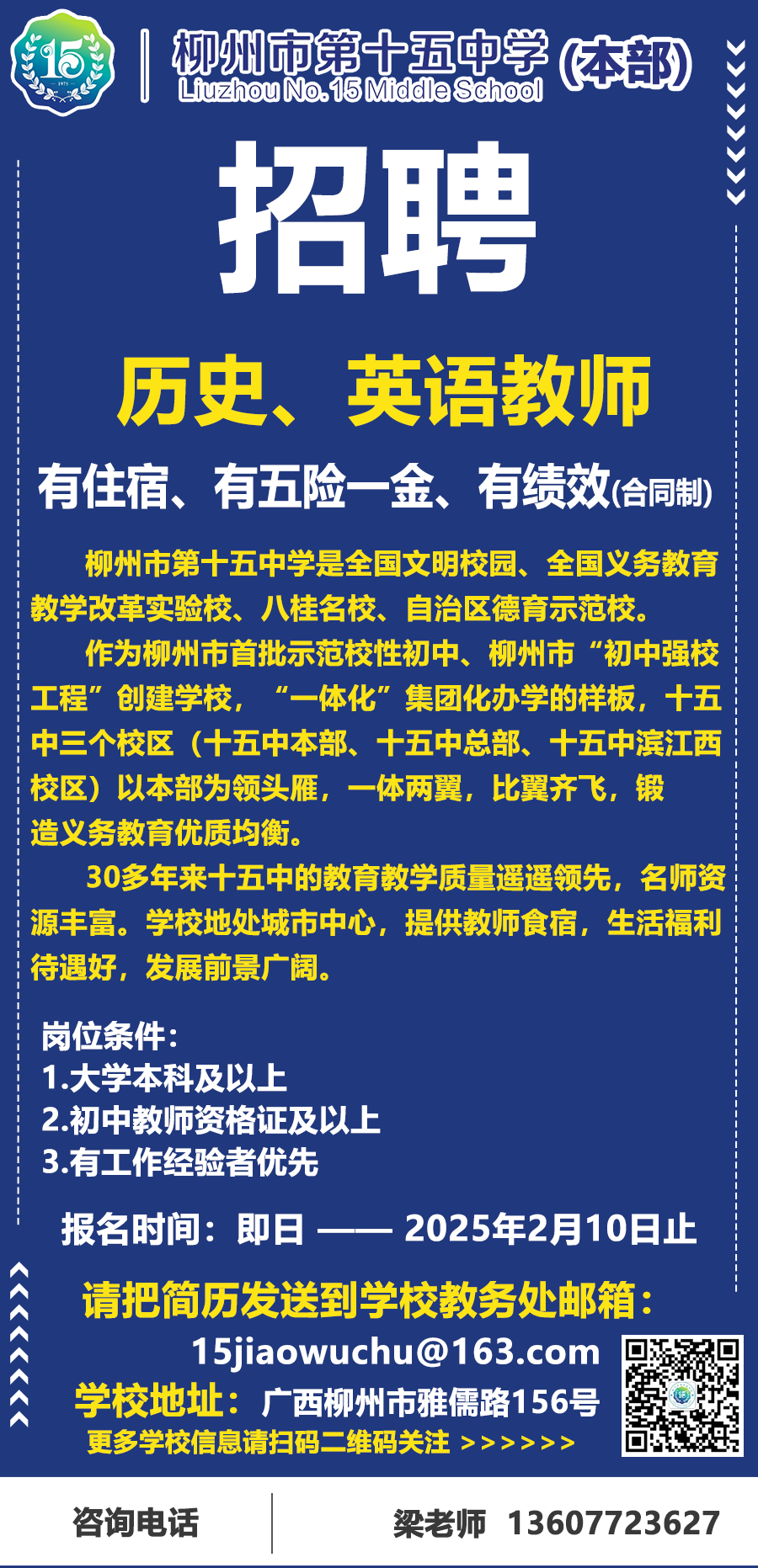 2025年柳州市第十五中學本部誠聘歷史、英語老師
