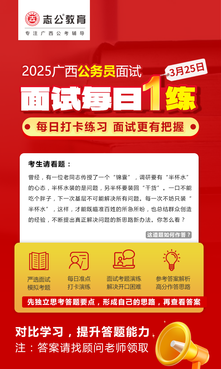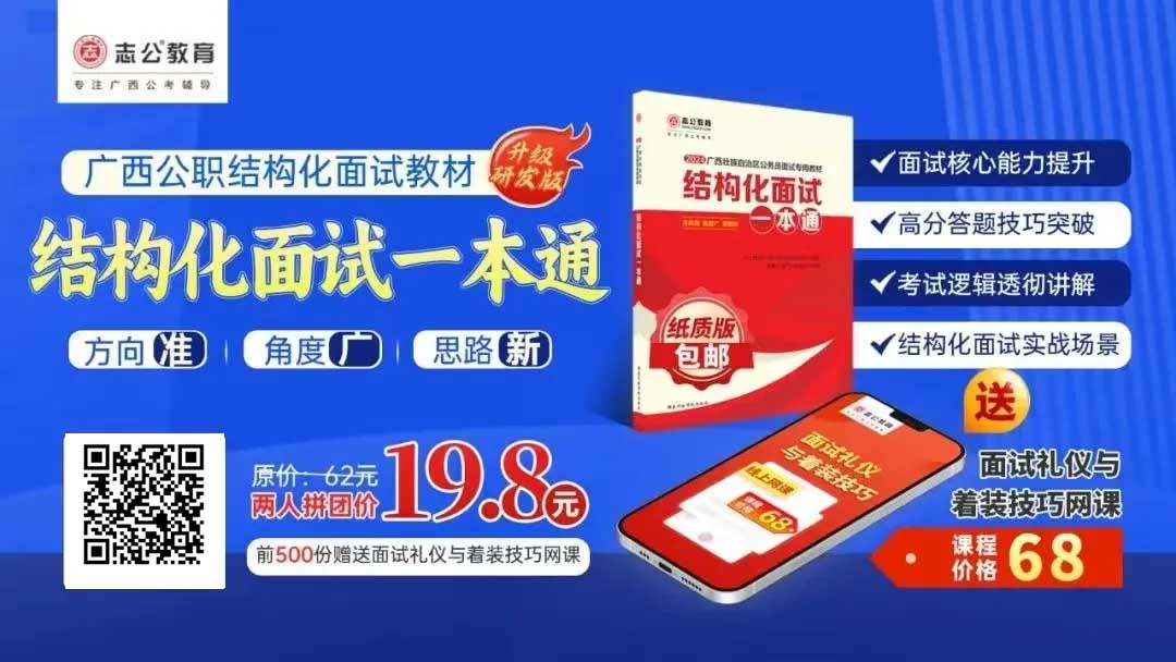 廣西區(qū)考面試準(zhǔn)備需緊扣本土特色,強化邏輯表達(dá)和實務(wù)能力,同時注重細(xì)節(jié)(如資格復(fù)審材料、禮儀)。建議從現(xiàn)在起每天練習(xí)2-3套題,持續(xù)積累廣西熱點案例,爭取面試高分!資料已經(jīng)為大家準(zhǔn)備好了,快去看看吧!
