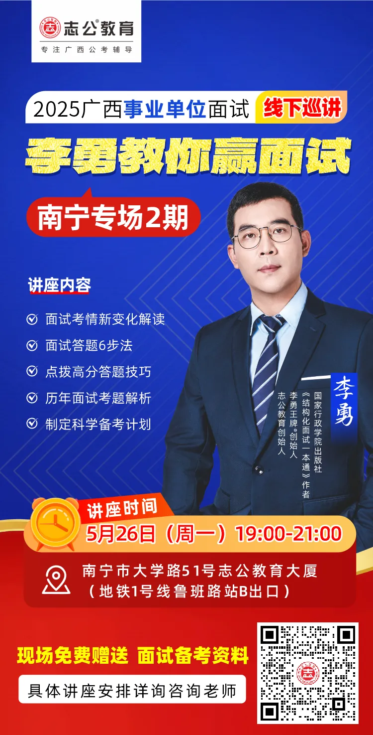 原文標(biāo)題:李勇教你贏面試!2025廣西事業(yè)單位面試線下巡講南寧專場(chǎng)今天等你來!