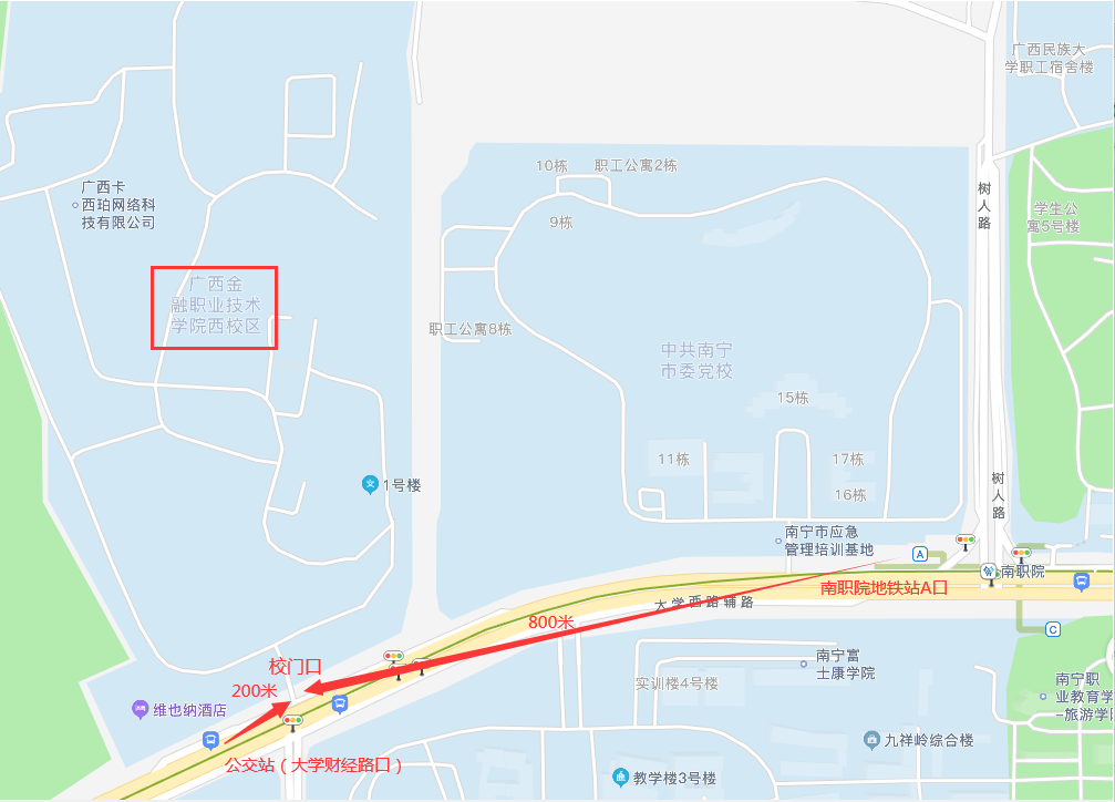 學(xué)校位于南寧市西鄉(xiāng)塘區(qū)大學(xué)西路168號,可乘坐公交車103路、807路大學(xué)財(cái)經(jīng)路口下,或乘坐地鐵1號線到“南職院”站A口出站(如圖所示)。
