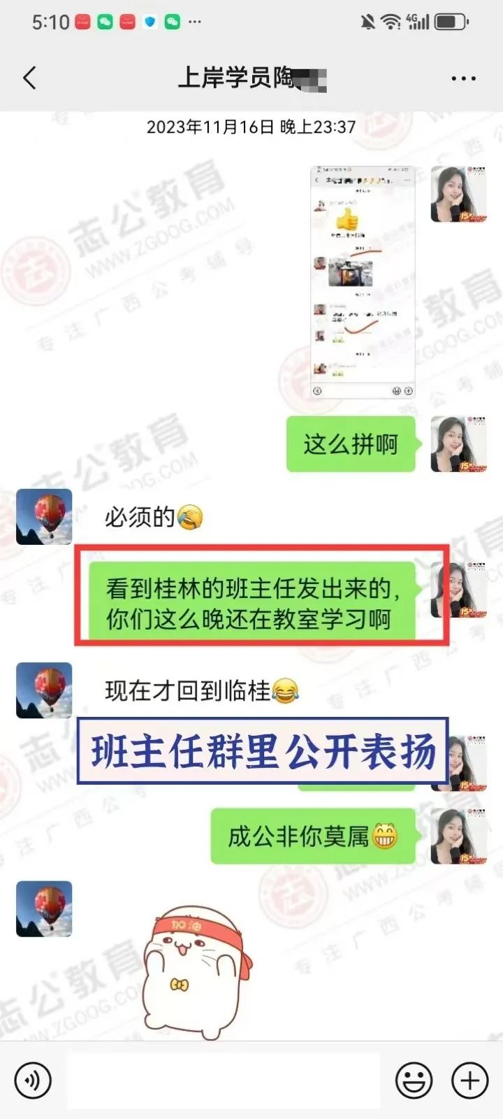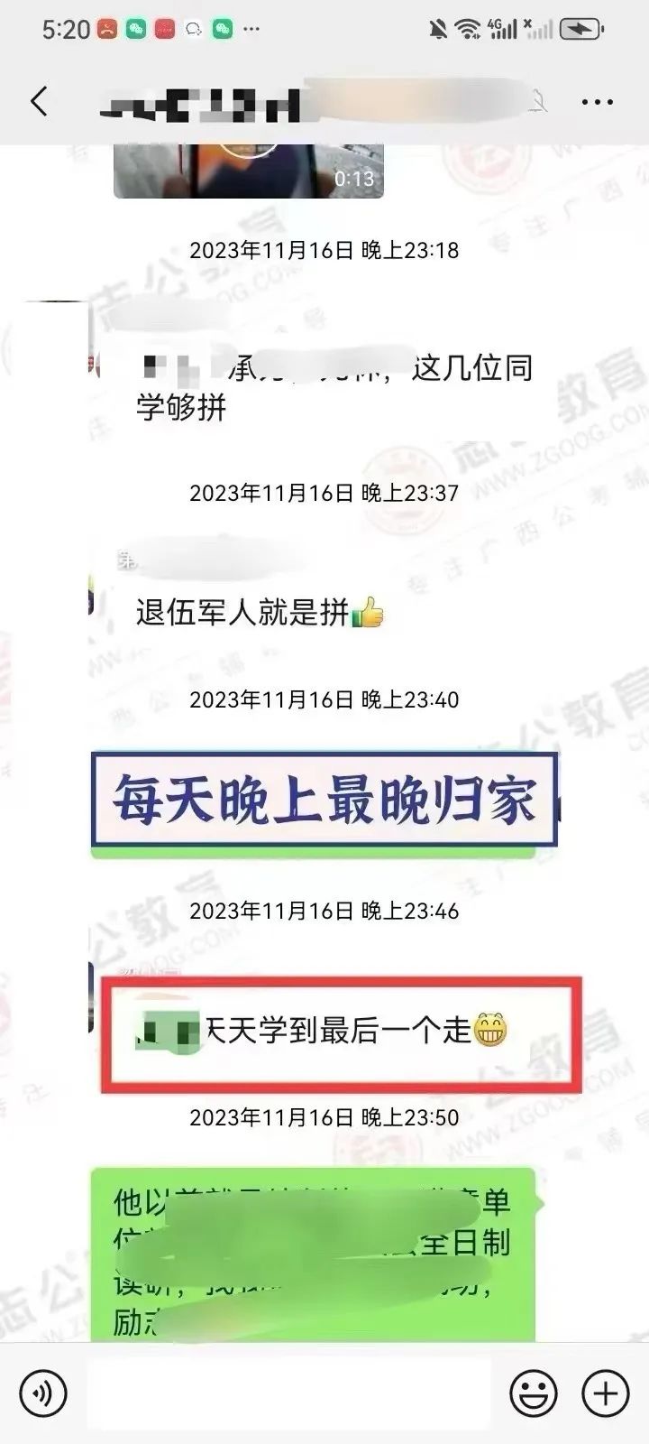 在備考的日子里,無數(shù)個夜晚,我看到他朋友圈發(fā)的經(jīng)常學習練習到教室關(guān)門最后一個才回家,無數(shù)次往返南寧和桂林兩座城市,只為家庭和研究生學業(yè)和公務(wù)員備考的有序進行,讓我印象最深的一次,就是他微信拍了一張正在打針輸液的照片發(fā)給我,還打趣的跟我說:還好不影響我單手刷題! 即使學員因為身體過于勞累導致生病在吊針,也絲毫沒有懈怠過學習,讓我非常的佩服和感動。