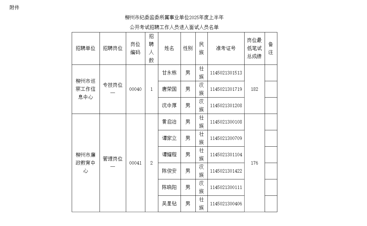 附件:《柳州市紀(jì)委監(jiān)委下屬事業(yè)單位2025年度上半年公開(kāi)考試招聘工作人員進(jìn)入面試人員名單》