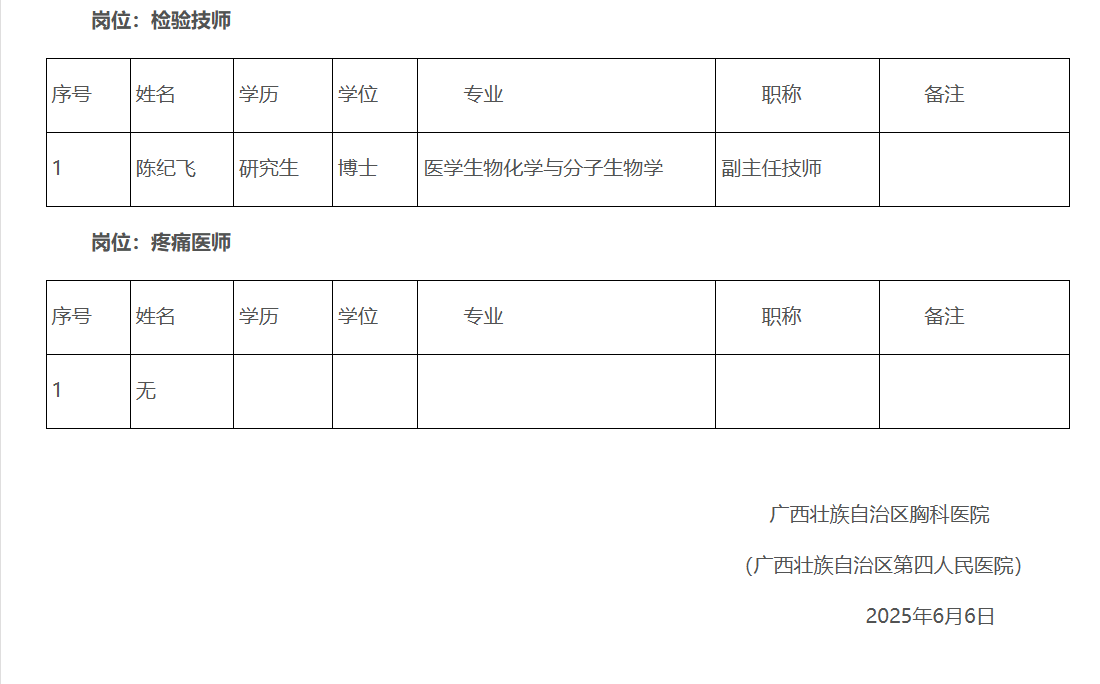 根據(jù)《自治區(qū)胸科醫(yī)院2025年度高層次人才公開招聘實(shí)名編制工作人員公告》要求,現(xiàn)將自治區(qū)胸科醫(yī)院2025年度高層次人才公開招聘實(shí)名編制工作人員報(bào)名通過(guò)資格審查人員名單公布如下: