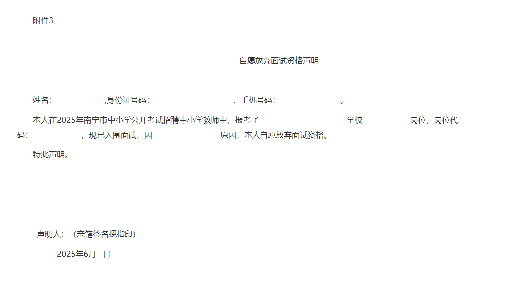 (四)放棄面試資格的報(bào)考人員,應(yīng)及時(shí)向面試資格復(fù)審單位提供書(shū)面放棄面試資格說(shuō)明材料(詳見(jiàn)附件3,包含:報(bào)考單位、崗位名稱(chēng)和代碼、注明身份證號(hào)碼、手機(jī)號(hào)碼、本人簽名捺手印,材料可傳真或掃描發(fā)送郵箱:rs8223408@126.com),否則按相關(guān)規(guī)定處理。