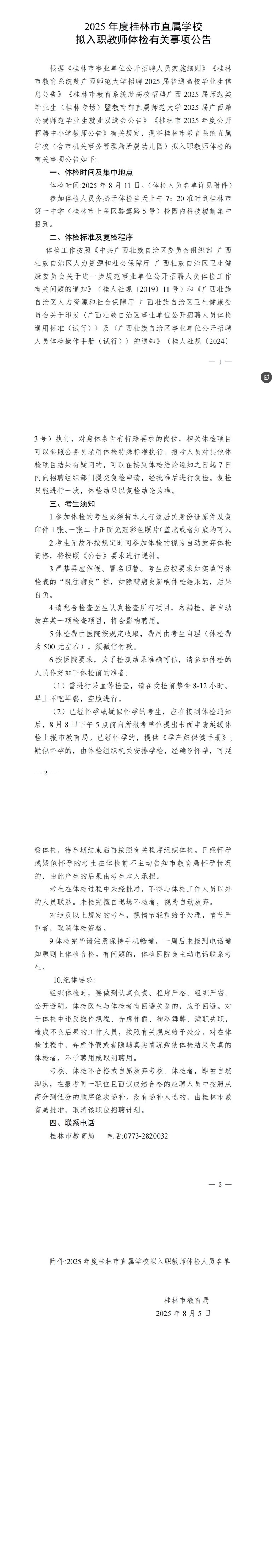 2025年度桂林市直屬學(xué)校擬入職教師體檢有關(guān)事項(xiàng)公告