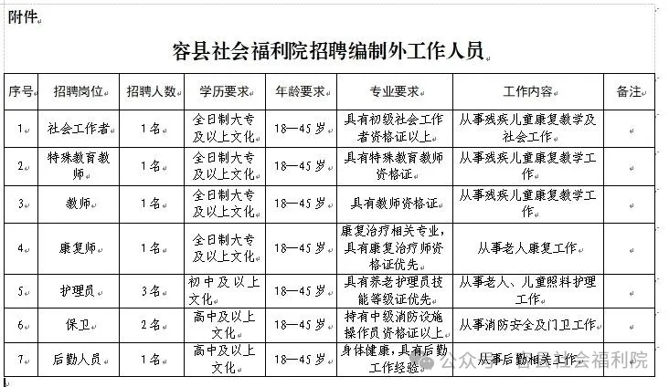 根據(jù)工作需要,容縣社會(huì)福利院面向社會(huì)公開招聘編制外工作人員若干名,現(xiàn)將有關(guān)事項(xiàng)公告如下: