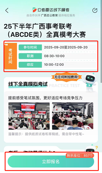 1??全zhen模擬高度還原:嚴(yán)格按照廣西事業(yè)單位聯(lián)考流程和時(shí)間進(jìn)行,試卷對(duì)標(biāo)zhen題,考場安排也高度還原,給你沉浸式考試體驗(yàn)。