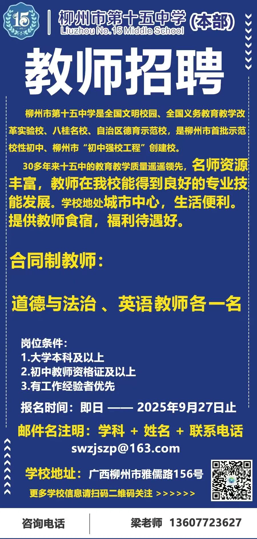 原文標(biāo)題:柳州市第十五中學(xué)本部招聘公告