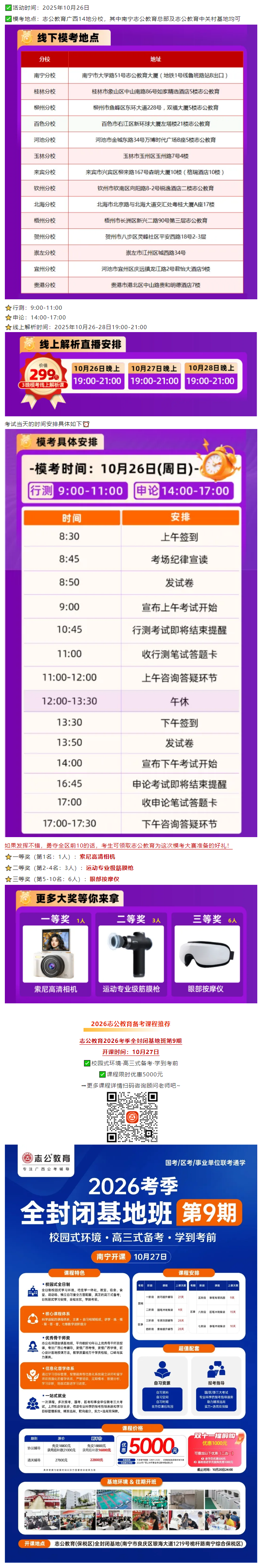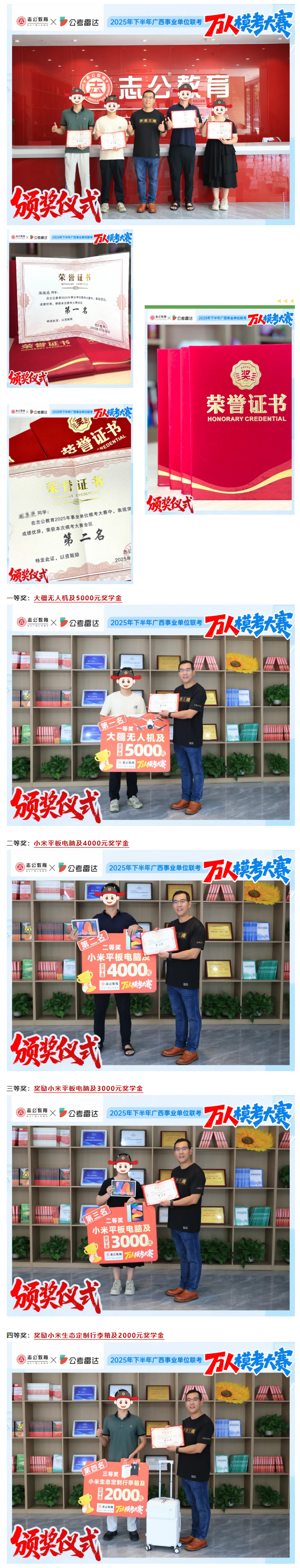 ??即筚惖膬r(jià)值不止于排名,更在于幫大家提前適應(yīng)節(jié)奏、找準(zhǔn)薄弱項(xiàng),這些獎(jiǎng)勵(lì)是認(rèn)可,更是激勵(lì)!愿大家?guī)е@份動(dòng)力繼續(xù)沖刺備考目標(biāo),頒獎(jiǎng)儀式落幕,但備考沖刺的號(hào)角剛剛吹響,未參與本次??嫉目忌鸁o(wú)需遺憾,志公教育下一期??即筚惣磳?dòng)!依舊是全真考場(chǎng)復(fù)刻、專(zhuān)業(yè)師資護(hù)航、豐厚獎(jiǎng)品加持!立刻報(bào)名參與大賽吧,說(shuō)不定下一個(gè)登臺(tái)領(lǐng)獎(jiǎng)的就是你!