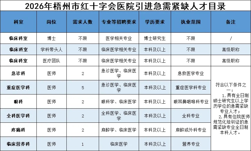 符合條件者享受梧州市高層次(緊缺)人才引進(jìn)政策和梧州市紅十字會醫(yī)院急需緊缺人才引進(jìn)政策,提供事業(yè)單位編制及安家費(fèi):