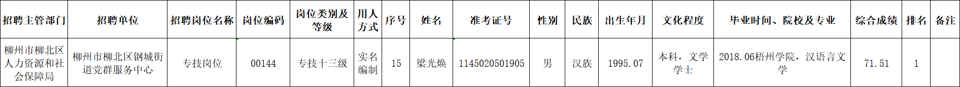 根據(jù)《柳州市2025年度下半年事業(yè)單位公開考試招聘工作人員公告》要求及安排,梁光煥同志經(jīng)面試、考察、體檢合格,符合聘用條件。經(jīng)研究決定,擬聘用梁光煥同志為我區(qū)事業(yè)單位工作人員,現(xiàn)予以公示,公示期為5個工作日(2026年1月22日至2026年1月28日)。對擬聘用的同志如有異議,請以書面形式,并署真實姓名和聯(lián)系地址,于2026年1月28日前郵寄或直接送我單位(地址:柳州市勝利路12-8號柳北區(qū)政府4樓417室;郵編:545002,電話0772-2513360),群眾如實反映有關(guān)問題受法律保護(hù)。