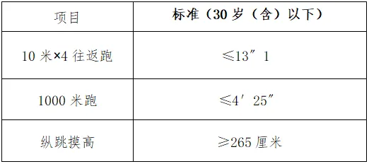 體能測(cè)評(píng)項(xiàng)目中,縱跳摸高的測(cè)試次數(shù)不超過(guò)3次,10米×4往返跑測(cè)評(píng)次數(shù)為2次,1000米跑的測(cè)評(píng)次數(shù)為1次。應(yīng)聘人員體能測(cè)評(píng)三項(xiàng)全部達(dá)標(biāo)的方為合格。